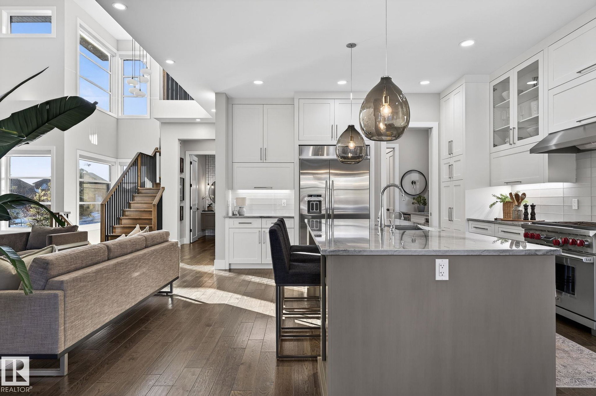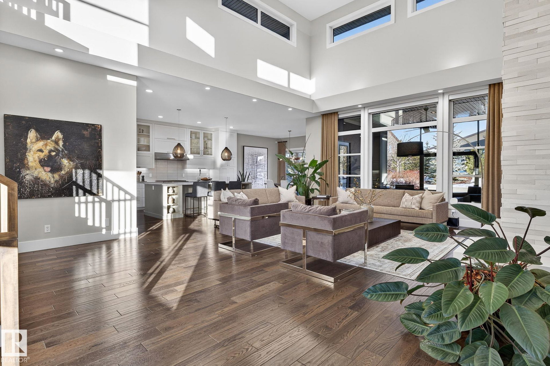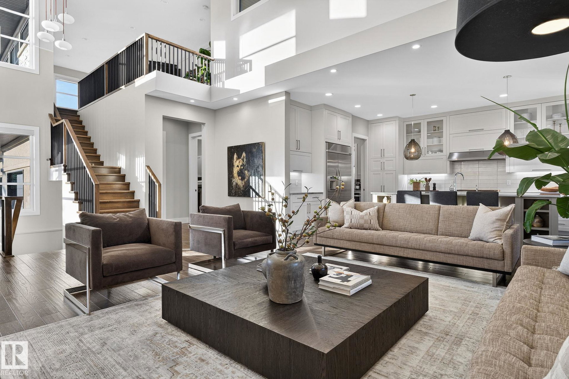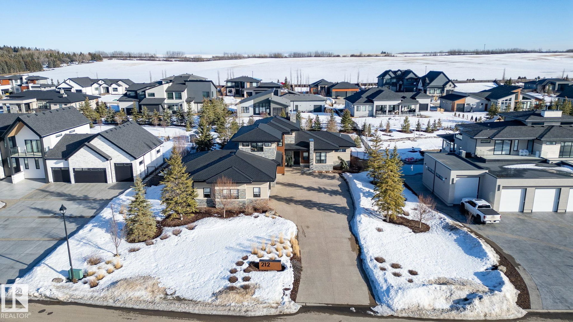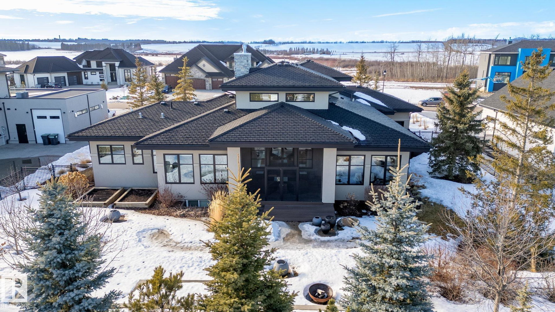 Nestled on a private, sprawling property in Rural Sturgeon County, this luxurious executive bungalow offers over 5,400 sq ft of thoughtfully designed living space, combining elegance with functionality. The open-concept main floor features soaring ceilings, a sun-filled great room with floor-to-ceiling windows, and a striking fireplace. The chef-inspired kitchen boasts quartz counters, professional-grade appliances, custom cabinetry, and a walk-through pantry. The primary retreat includes a spa-like ensuite with a soaker tub, dual vanities, a walk-in shower, and a custom closet. A second bedroom with ensuite, mudroom, and laundry complete the main level. The lower level features two bedrooms, a Jack-and-Jill bath, expansive family room with wet bar, gym, and storage. Outdoors, landscaped grounds, tiered patios, and a triple garage with workshop offer the perfect blend of luxury, privacy, and country living minutes from St. Albert and Edmonton.