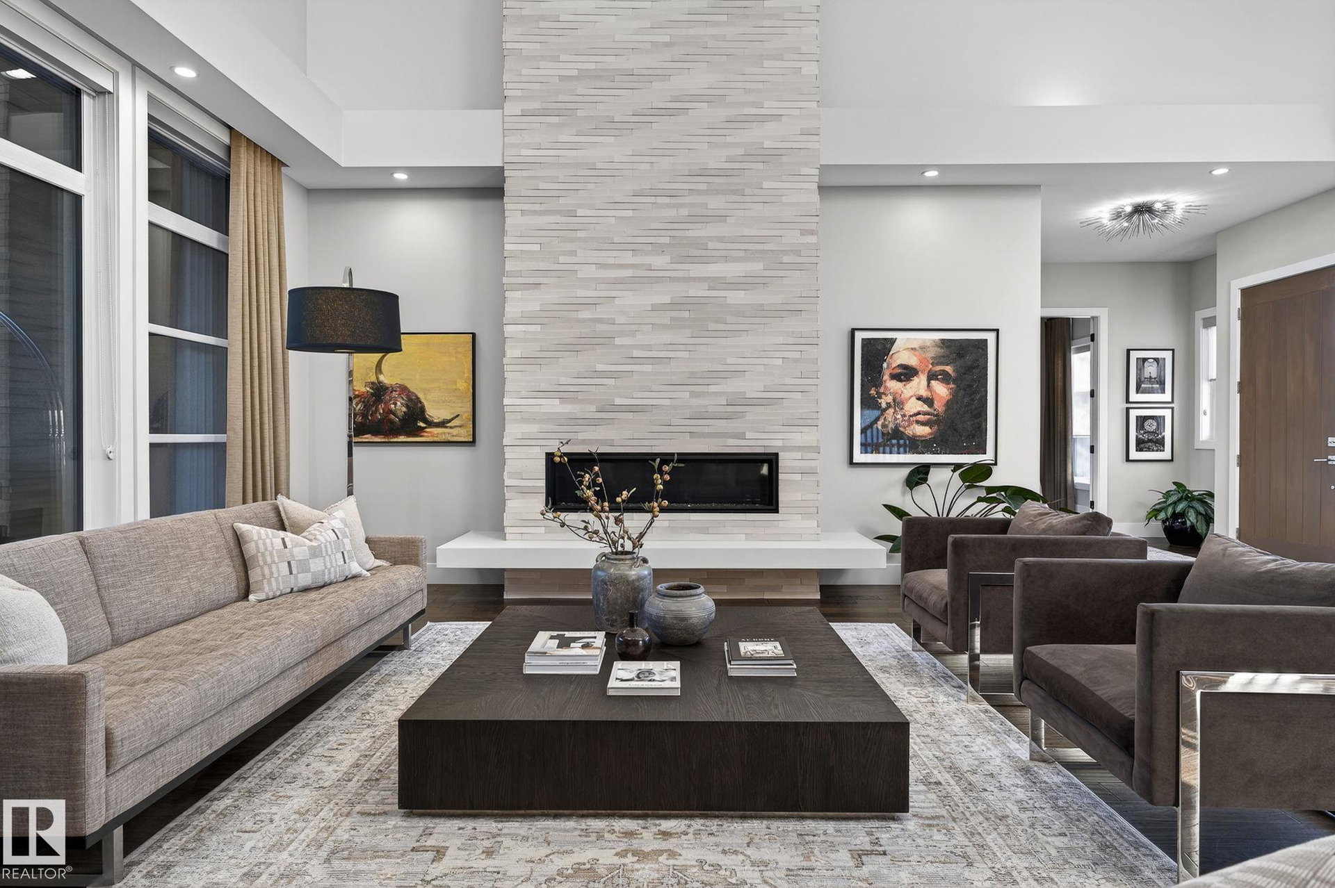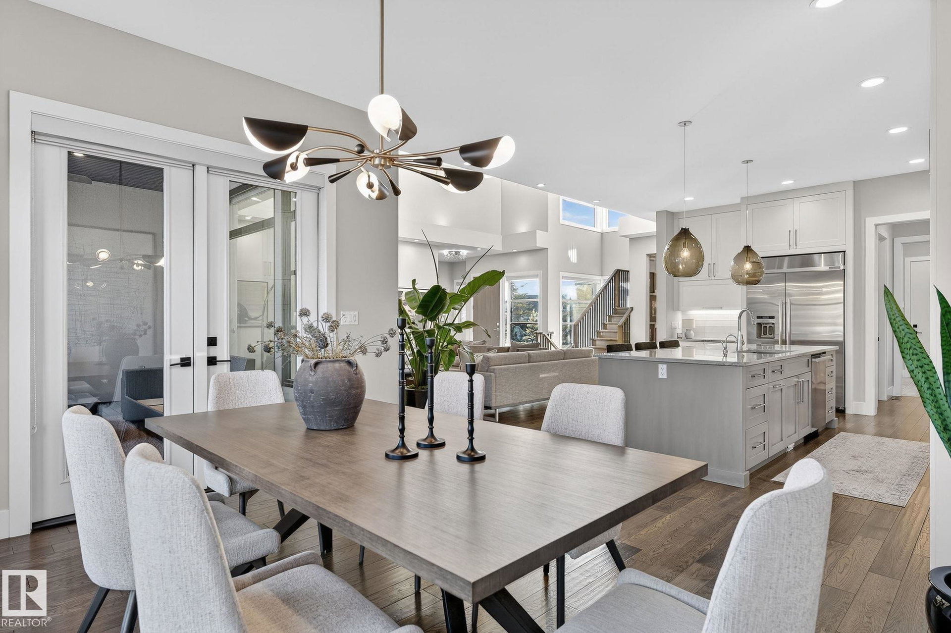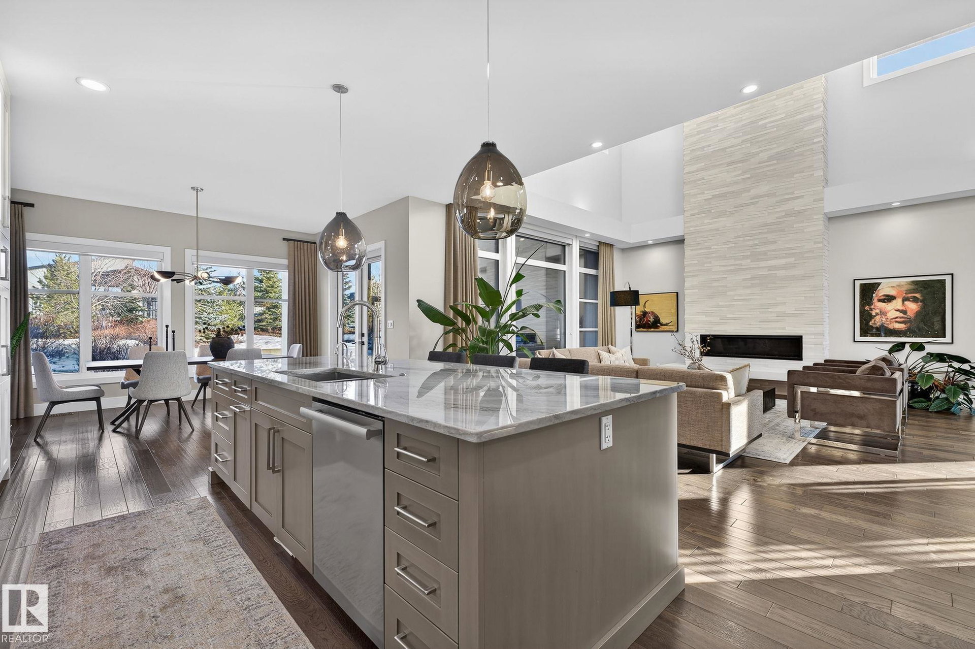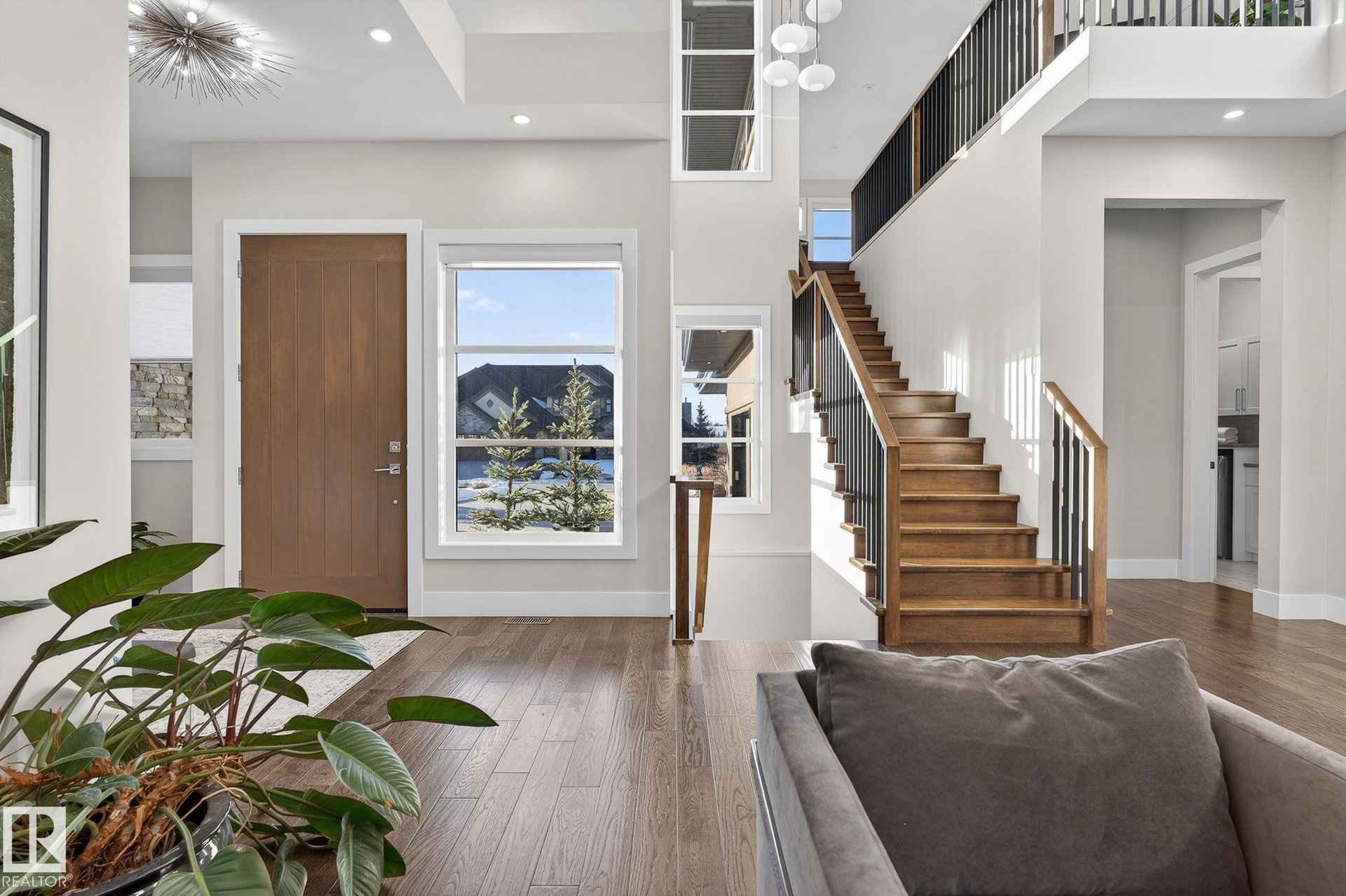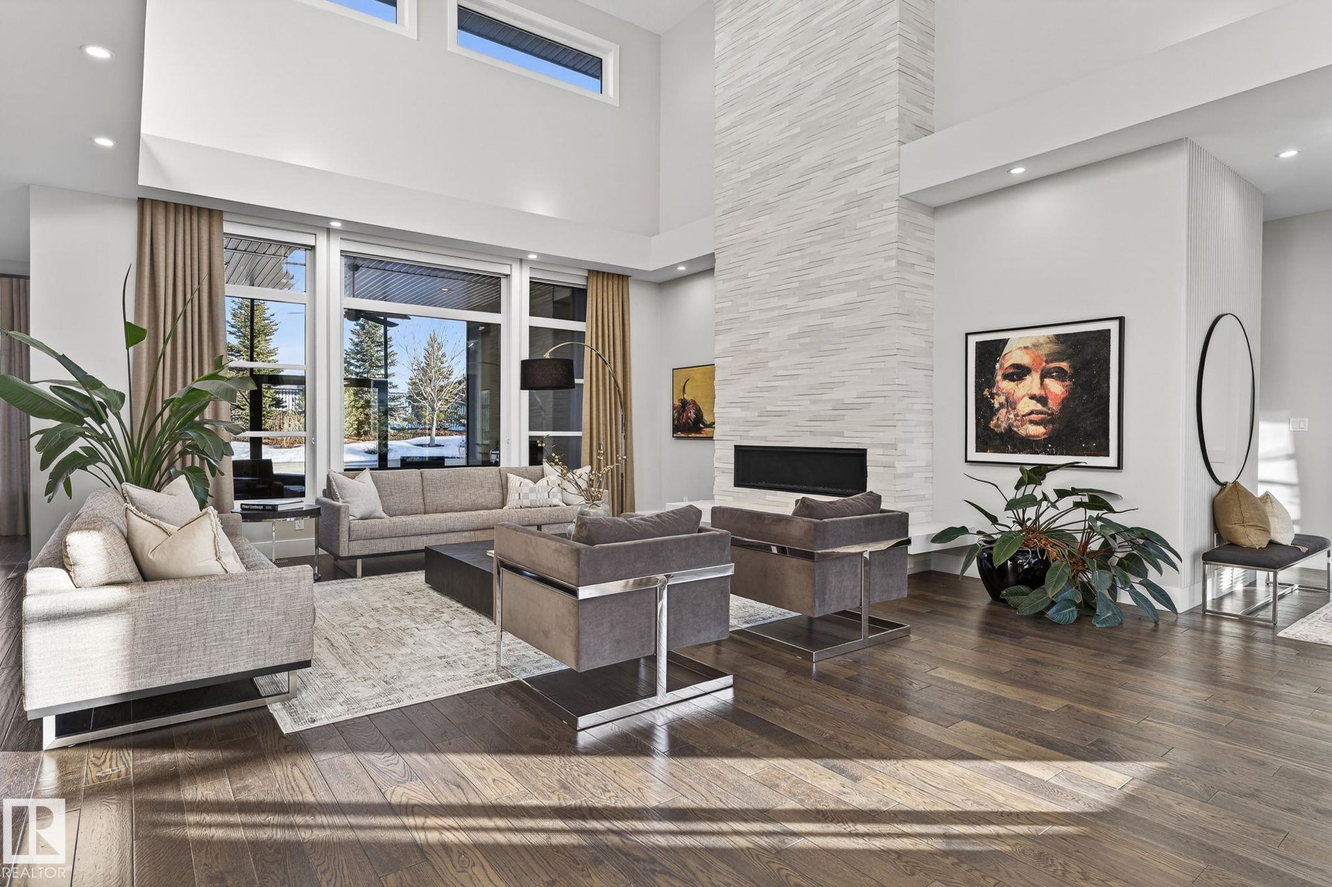 Nestled on a private, sprawling property in Rural Sturgeon County, this luxurious executive bungalow offers over 5,400 sq ft of thoughtfully designed living space, combining elegance with functionality. The open-concept main floor features soaring ceilings, a sun-filled great room with floor-to-ceiling windows, and a striking fireplace. The chef-inspired kitchen boasts quartz counters, professional-grade appliances, custom cabinetry, and a walk-through pantry. The primary retreat includes a spa-like ensuite with a soaker tub, dual vanities, a walk-in shower, and a custom closet. A second bedroom with ensuite, mudroom, and laundry complete the main level. The lower level features two bedrooms, a Jack-and-Jill bath, expansive family room with wet bar, gym, and storage. Outdoors, landscaped grounds, tiered patios, and a triple garage with workshop offer the perfect blend of luxury, privacy, and country living minutes from St. Albert and Edmonton.